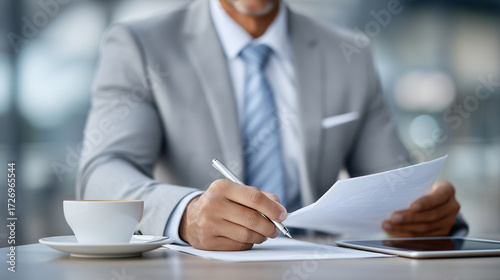 Gray-suited professional studies documents, stamping work, coffee + tablet on executive desk