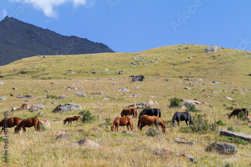 Grazing horses near Tor Ashuu Pass in Kyrgyzstan