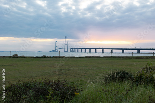 Great belt bridge in golden hour, with view from grass plains, Horizontal.