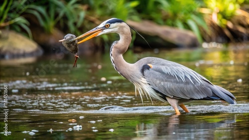 great, blue, heron, bird, stream, water, catch, prey, beak, wing, feather, talon, river, forest, foliage, green, brown, grey, nature, wildlife, fauna, animal, fishing, hunt, predator, capture, duck pond, outdoors, shallow, sunlight, environment, ecosystem, aquatic, life, vibrant, colours, detail, closeup, sharpened, sharp, photo, image, photo