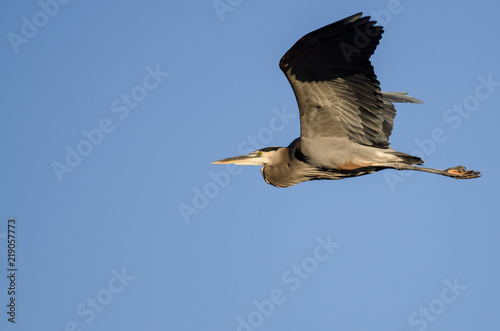 Great Blue Heron Flying in a Blue Sky