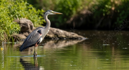 Great Blue Heron Standing in Water, Reflecting in the Sunlight.