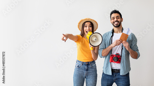 holiday maker, passport, traveler, carefree, guy, pointing, deal, panorama, happy, leisure, holiday, fun, empty space, copy space, female, woman, free space, photographer, excited, speaker, trip, spouse, joy, sightseeing, adult, offer, smile, megaphone, lifestyle, journey, tour tourism, studio, holding, emotional, person, man, male, vacation, hat, wall, loudspeaker, couple, diverse, baggage, travel, preparation, young