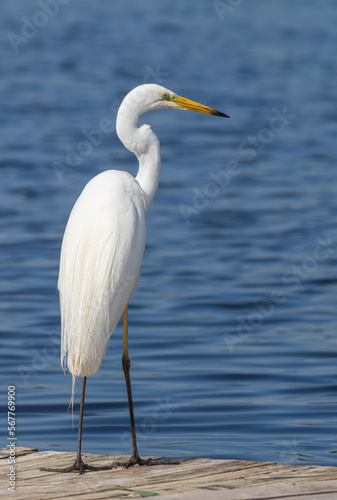 Great egret, Ardea alba. A bird stands on a fishing bridge on the riverbank