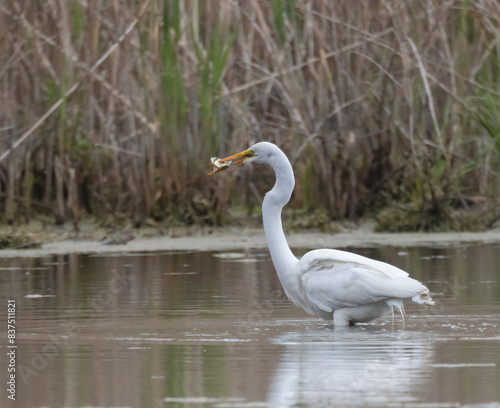 Great Egret eating a fish in a marsh habitat in Ontario in springtime