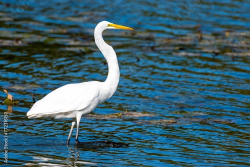 great egret, walking, lake, bird, white, heron, plumage, tranquil, duck pond, serene, water, nature, side, grace, aquatic, natural, habitat, calm, beauty, peaceful, animal, ornithology, birding, fauna, wildlife, environment
