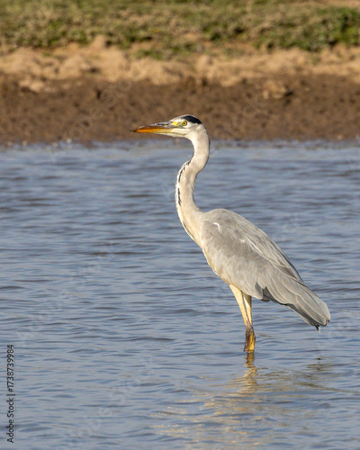 Great European heron in the lake watching for fish.