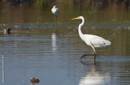 great white egret looks to the left, great egret wading through the water , white bird with yellow beak, white feathers, calm scene, great white bird