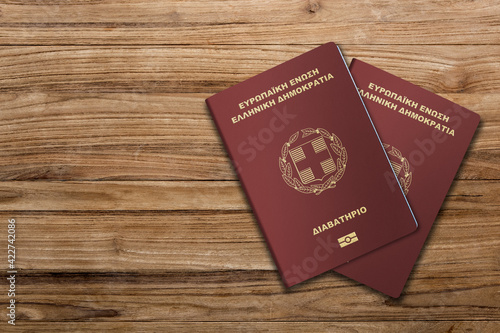Greek passports are issued exclusively to Greek citizens for the purpose of international travel, Greek passport on a wooden background