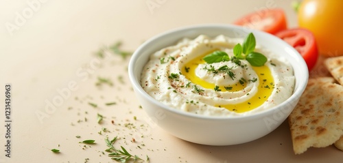 Greek Pita Spread with Fresh Vegetables in White Bowl Against Beige Background