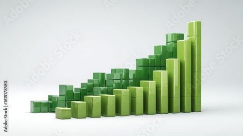 Green 3D bar chart with varying heights, representing growth or data visualization on a light background.