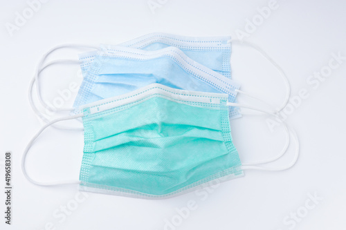 Green and blue disposable surgical face mask dirty top view. Mask protective coronavirus isolated on white background with copy space. Healthcare medical hygiene concept.