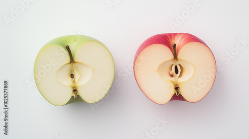 green apple or red apple: a close-up, top-down view of green apple slices and red apple slices, placed side by side with a small gap on a white background