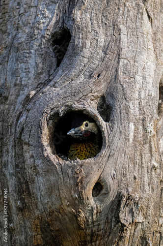 Green barred Woodpecker in forest environment, La Pampa province, Patagonia, Argentina.