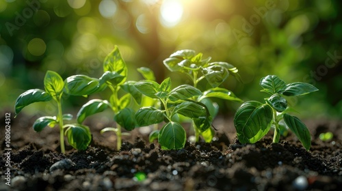 Green Basil Seedlings Growing in Rich Soil with Sunlight