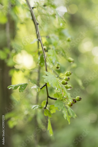 hawthorn, fruit, greener, dripped, water, after rain, leaf, tree branch, tree, detail, green, forest, nature, garden, shape