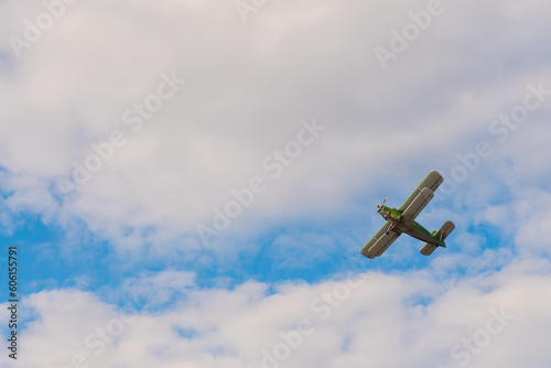 Green biplane, retro airplane flying in cloudy sky and doing stunts at Air Show. Performance, extreme, aerobatic, sport and aircraft concept