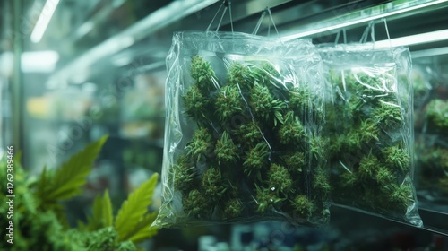 Green cannabis buds packaged for sale in a contemporary dispensary environment