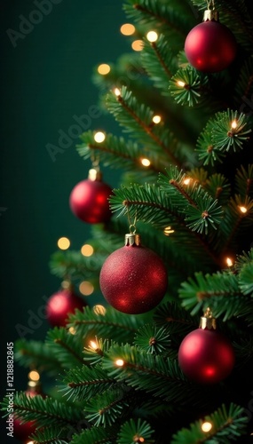 Green Christmas tree with ornaments and fairy lights, colored lights, decorated evergreen, festive decor