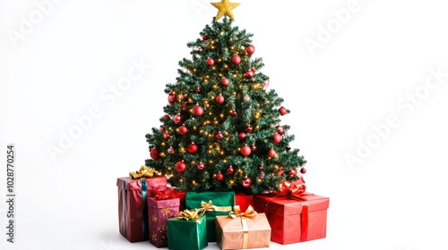 green christmas tree with ornaments and gifts