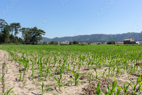 Green corn maize field in early stage (Leaf Stages (Vn)). Corn agriculture in Esposende, Portugal. Green nature. Rural field on farm land in spring.