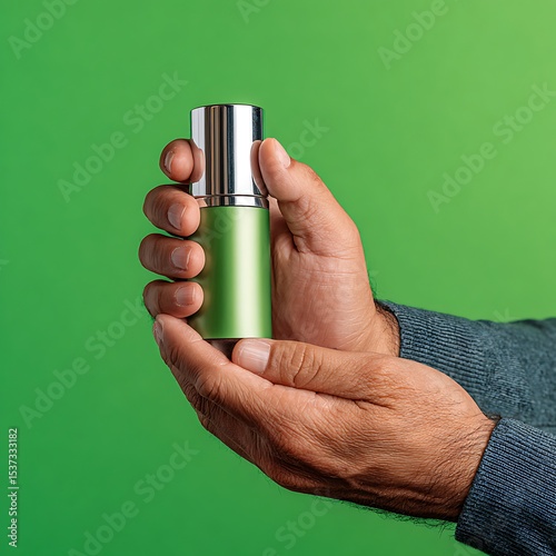 hand, holding, cosmetic, bottle, green, skincare, product, cardboard box, container, beauty, presentation, isolated, background, studio shot, design, advertisement, marketing, beauty product, hygiene, health, wellness, lotion, serum, dispenser, metal, cap, minimalist, modern, clean, elegance, dermatology, spa, treatment, aromatherapy, herbal, natural, organic, environmentally friendly, sustainable, well-being, lifestyle