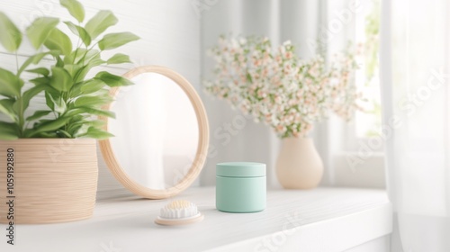 Green cosmetic cream jar on white wooden shelf with mirror, plant, and flowers in minimalist bathroom next to window