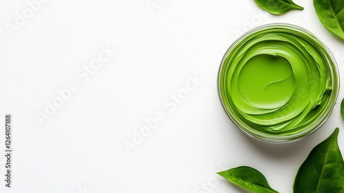 Green Cream in Jar Surrounded by Fresh Leaves on White Background