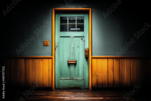 Green door in an old wooden hallway creating an inviting atmosphere during early evening
