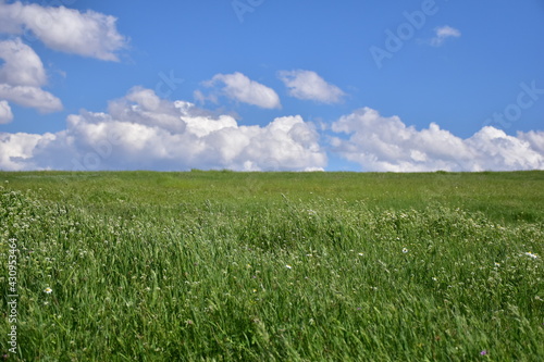 field, grass, sky, green, landscape, meadow, blue, nature, summer, spring, agriculture, cloud, horizon, cloud, rural, land, lawn, farm, countryside, sun, pasture, day, plant, wheat, hill