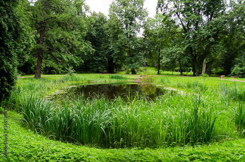 Green garden with grass. Summer courtyard with lawn. Beautiful summer landscape landscape park. Nature for background on postcard.