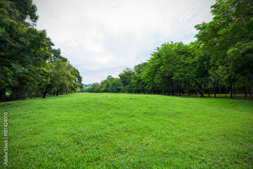 Green grass field in park at city center with business buildings in Bangkok, Thailand.