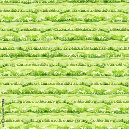 Green grass seamless pattern. Hand drawn watercolor illustration. Lush green grass landscape, meadow, park, farm, garden element. Fresh herbs and natural plants floral seamless pattern element