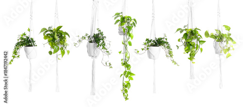 Green hanging house plants isolated on white, set