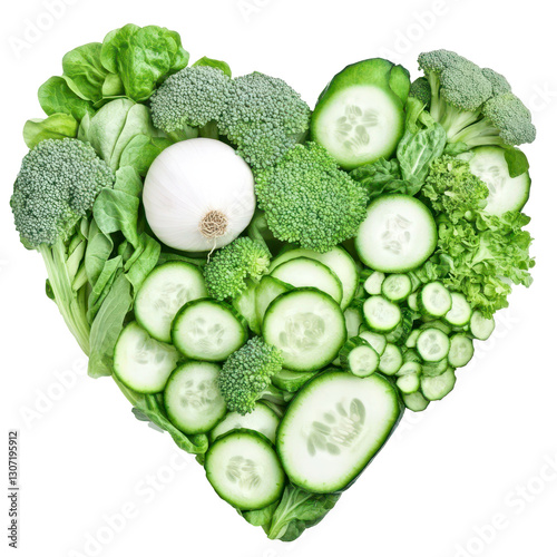 Green Heart: a vibrant collection of fresh, healthy green vegetables meticulously arranged in the shape of a heart, symbolizing a nourishing and wholesome diet.