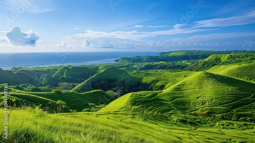 hill, green, ocean, sky, cloud, landscape, nature, grass, blue, horizon, tropical, view, scenery, field, mountain, rural, summer, fresh, beautiful, calm, serene, peaceful, tranquil, panorama, bright, sunny, natural, wide, open, high-coloured, foliage, lush, vibrant, terrestrial, scenic, vista