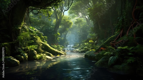 green, jungle, book, illustration, lush, tree, foliage, stream, vegetation, serene, peaceful, life, bird, monkey, swinging, dense, nature, wildlife, adventure, khan, story, classic, animal, forest