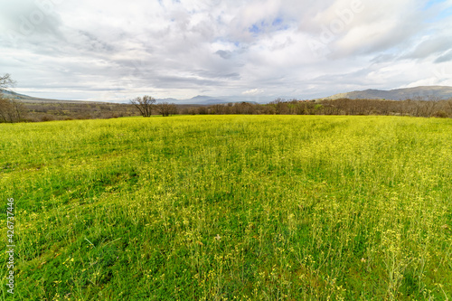 Green landscape with bonnet of yellow flowers and dramatic sky with large clouds. Madrid.