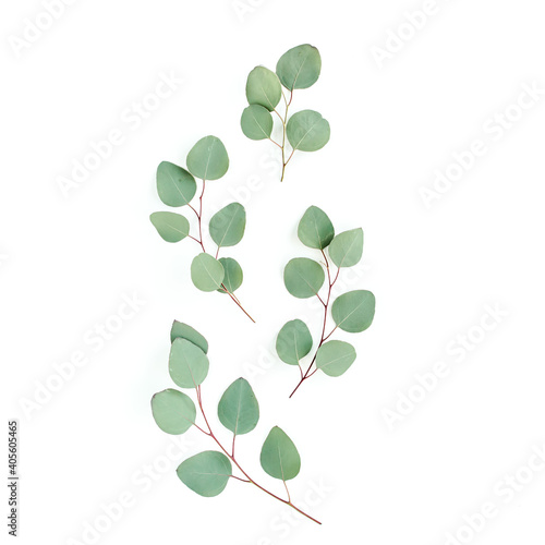 Green leaves eucalyptus isolated on white background. Flat lay, top view.