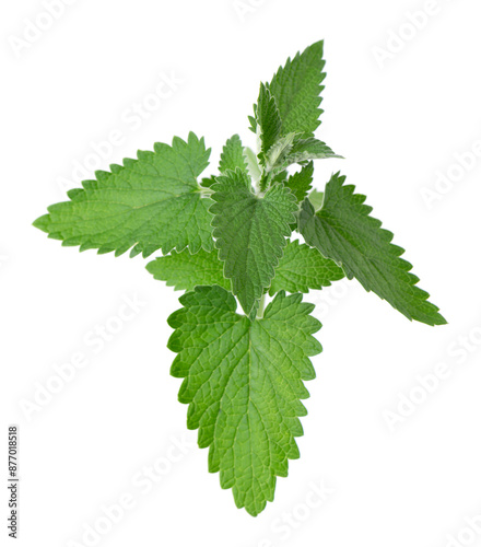 Green leaves of lemon balm or melissa plant isolated on white background. Fresh green mint leaf. Clipping path.