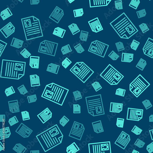 Green line Resume icon isolated seamless pattern on blue background. CV application. Searching professional staff. Analyzing personnel resume. Vector Illustration