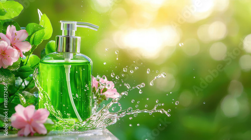 Green liquid soap dispenser with water splash and soft flowers