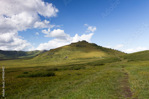 mountain, grass, landscape, green, sky, summer, vale, cloud, scenery, travel, view, nature, blue, beauty, field, highland, road, beautiful, heaven, horizontal, calmness, outlook, greenery, idylli, tranquil, air, mountain chain, mountainside, siberia, altai, natural, park, top, tour tourism, hiking, altai, adventure, cloud, horizon, altai