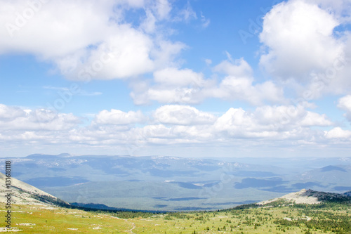 Green mountain valley landscape on a sunny summer day. Clouds shadows on the coniferous forest dark carpet. Path way going through meadow