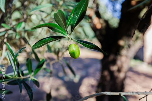 Green olive on a branch of an olive tree, ready for harvest. Summer on the farm