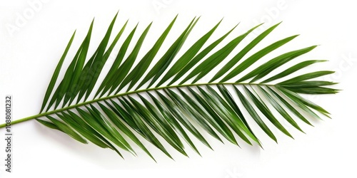 Green palm tree against a white background. Close-up of a green palm leaf.