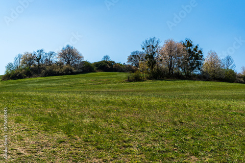 green pastures and trees blooming in spring on a clear day with blu e sky, czech beskydy