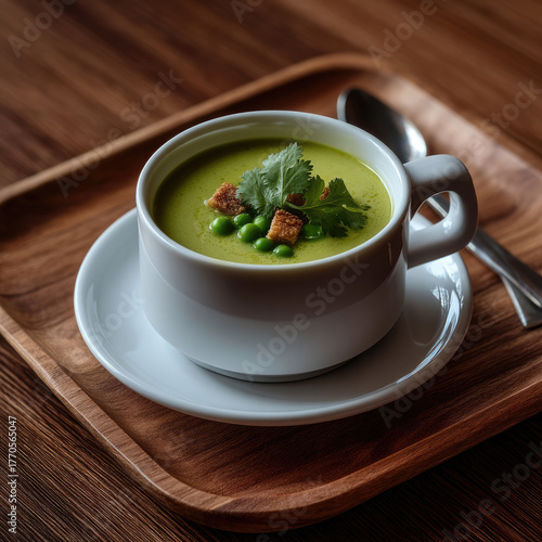 Green pea mint soup in white cup with croutons and cilantro garnish, served on wooden tray, fresh and healthy meal