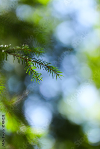 Green pine needles in sunlit forest with nature bokeh background
