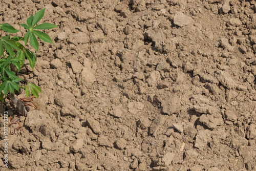 Green plants with dry land. Copy space for text. Dry land lacks water. Agricultural industry concept. For graphic design and banner background